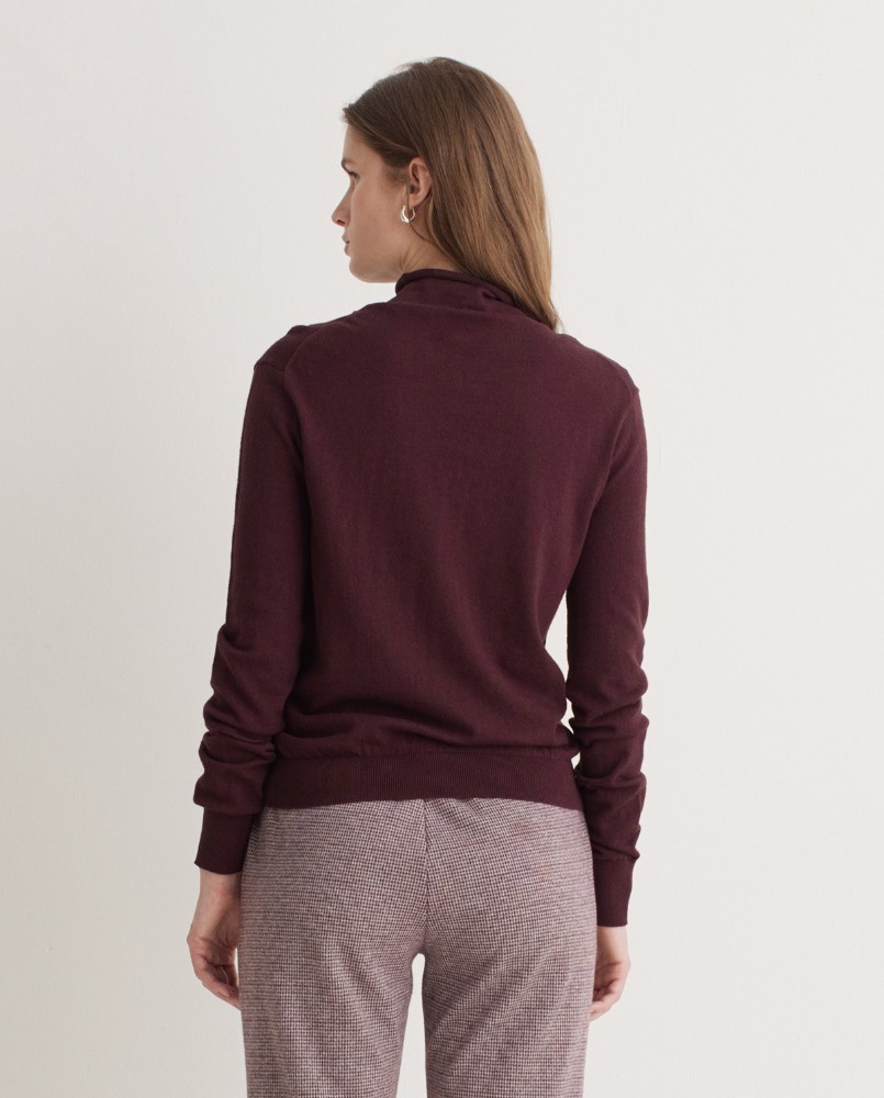 Jersey mezcla de algodón orgánico y lana. Cuello cisne. Manga larga. Bajos y puños acabados en canalé.